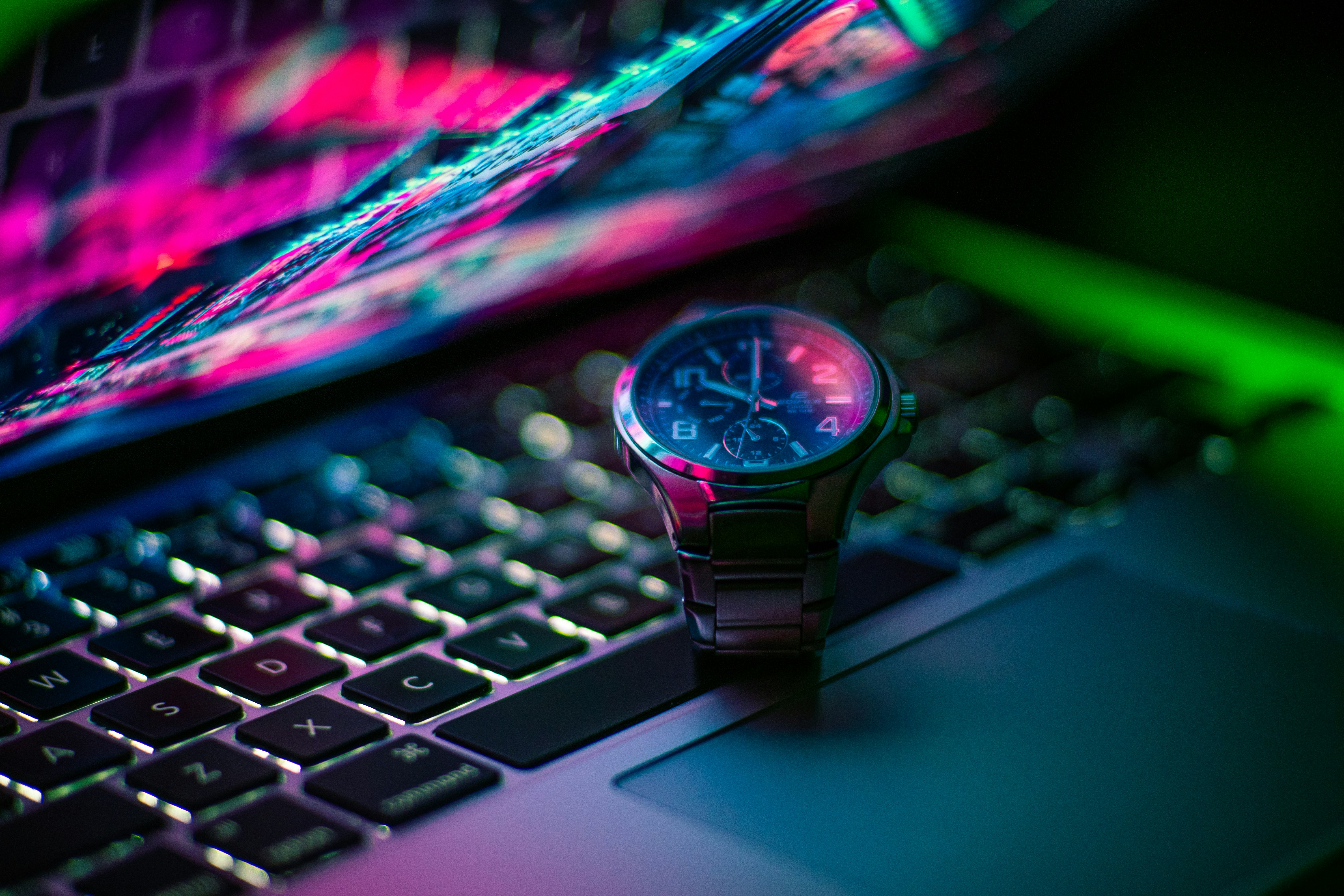 Black and silver round analog watch on macbook pro photo Free Color